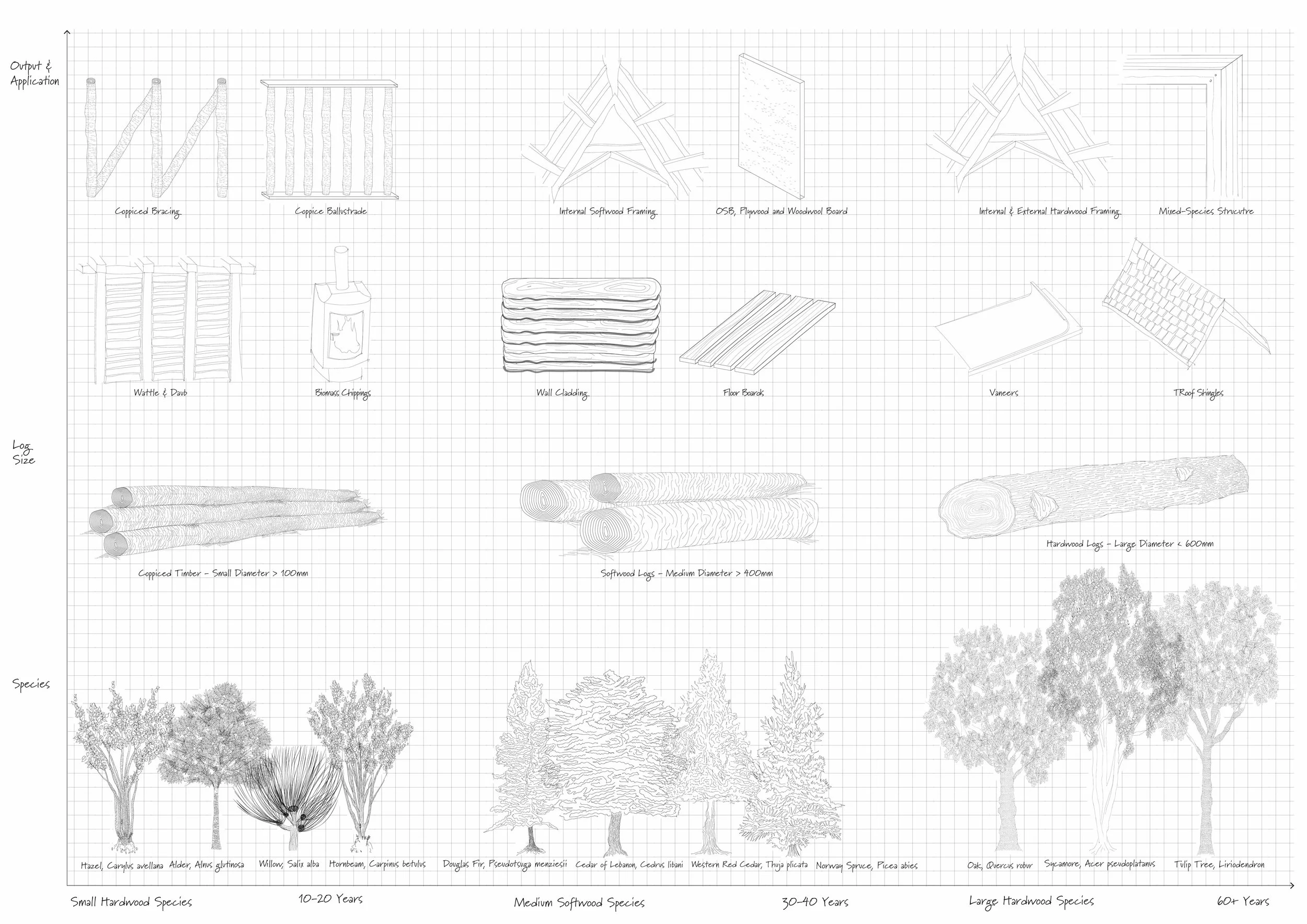Rooted Landscapes examines British Woodlands, recognising their lack of sustainable management, productivity and poor disease resilience; without intervention, current monoculture forestry practices will force the collapse of woodland ecosystems and available British timber. Therefore, this project proposes a sustainable forestry model that ignites ecological wealth in partnership with high-quality timber and design innovation.